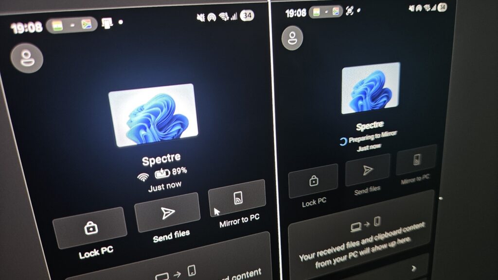 O compartilhamento da área de transferência foi ampliado. Textos e imagens copiados em um dispositivo podem ser colados no outro automaticamente, o que reduz etapas no fluxo de trabalho. O espelhamento da tela do celular no PC também ganhou um botão dedicado, tornando o acesso mais rápido.