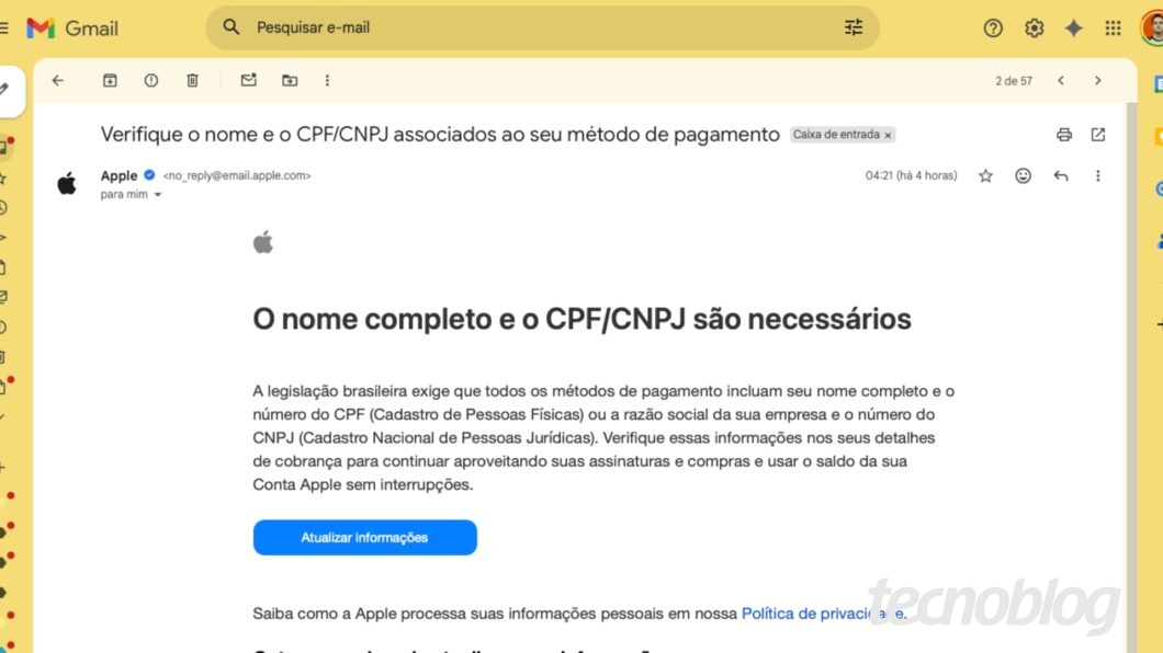 O email da Apple informa que “nome completo e o CPF/CNPJ são necessários”. No corpo da mensagem, a gigante de Cupertino explica que a legislação brasileira exige que tais dados estejam associados aos meios de pagamento utilizados nos serviços da Apple.