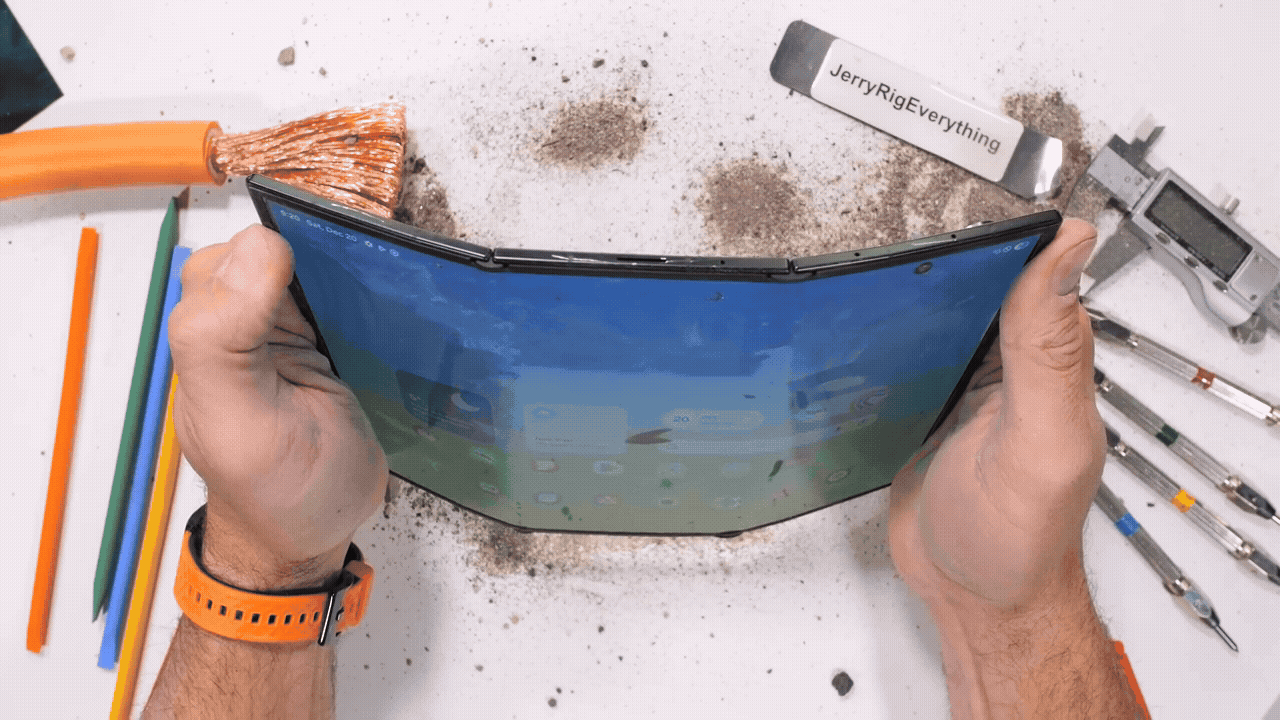 As dobradiças não são o único problema. No teste do canal JerryRigEverything, o Galaxy Z TriFold também foi submetido a arranhões, fogo e areia. Nesse último experimento, os grãos entraram na dobradiça, e foi possível ouvir os barulhos da sujeira no mecanismo.